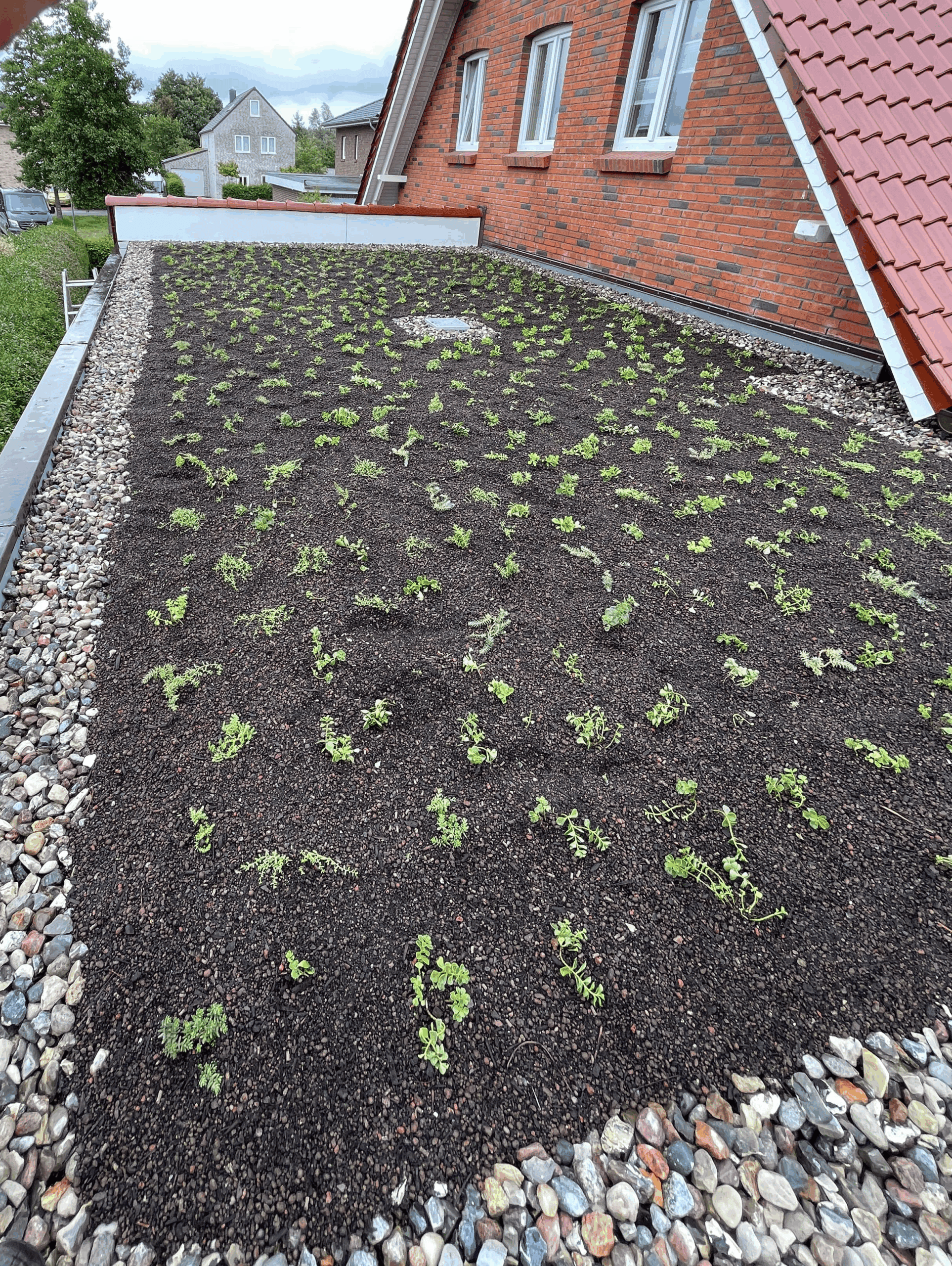 Dachbegrünung mit jungen Pflanzen auf geneigtem Flachdach